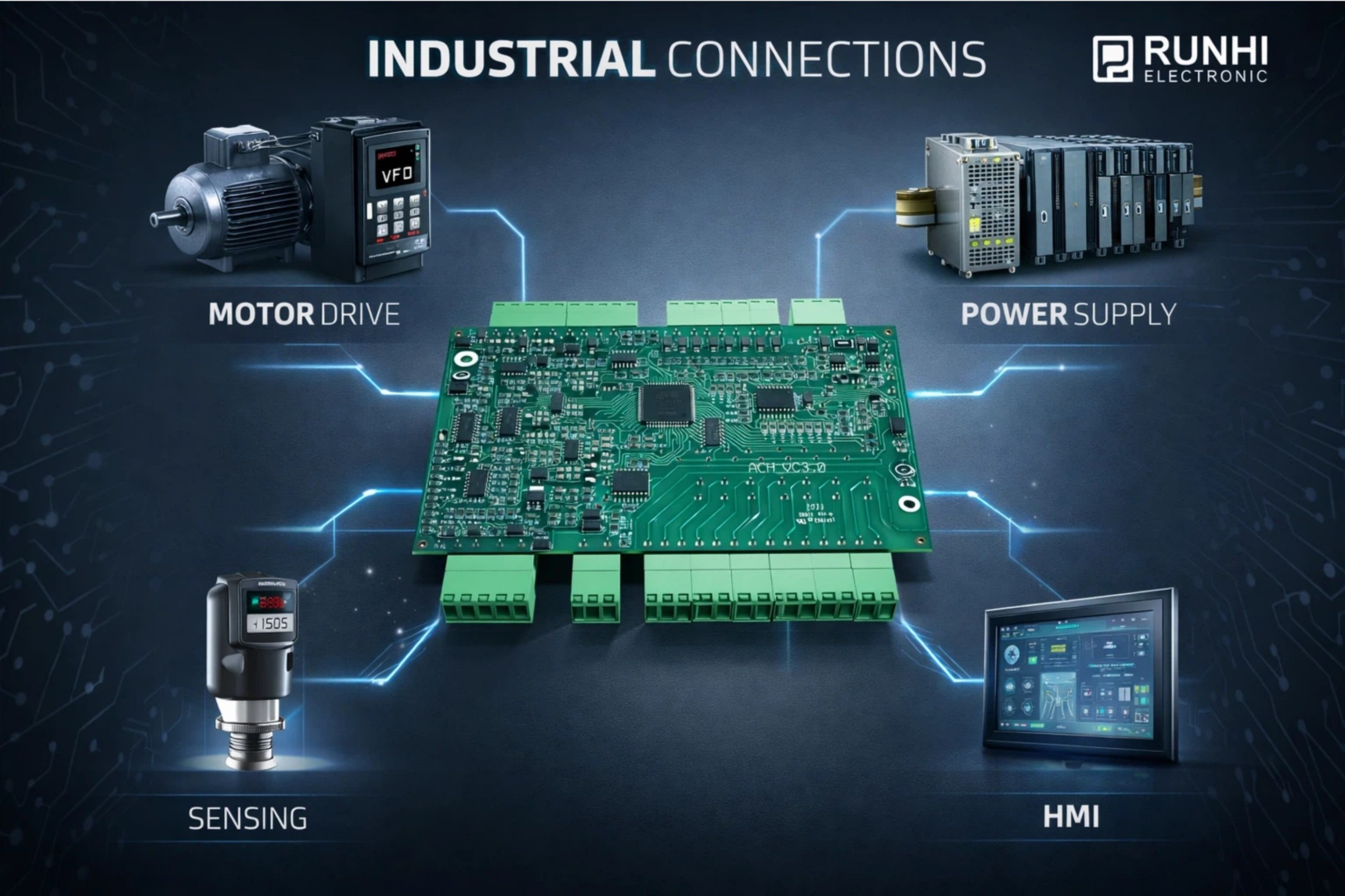 Runhi produced robust PCBA for Industrial Control Switches using FR4 2-Layer tech. Our mixed assembly ensures reliability for relays and terminals.