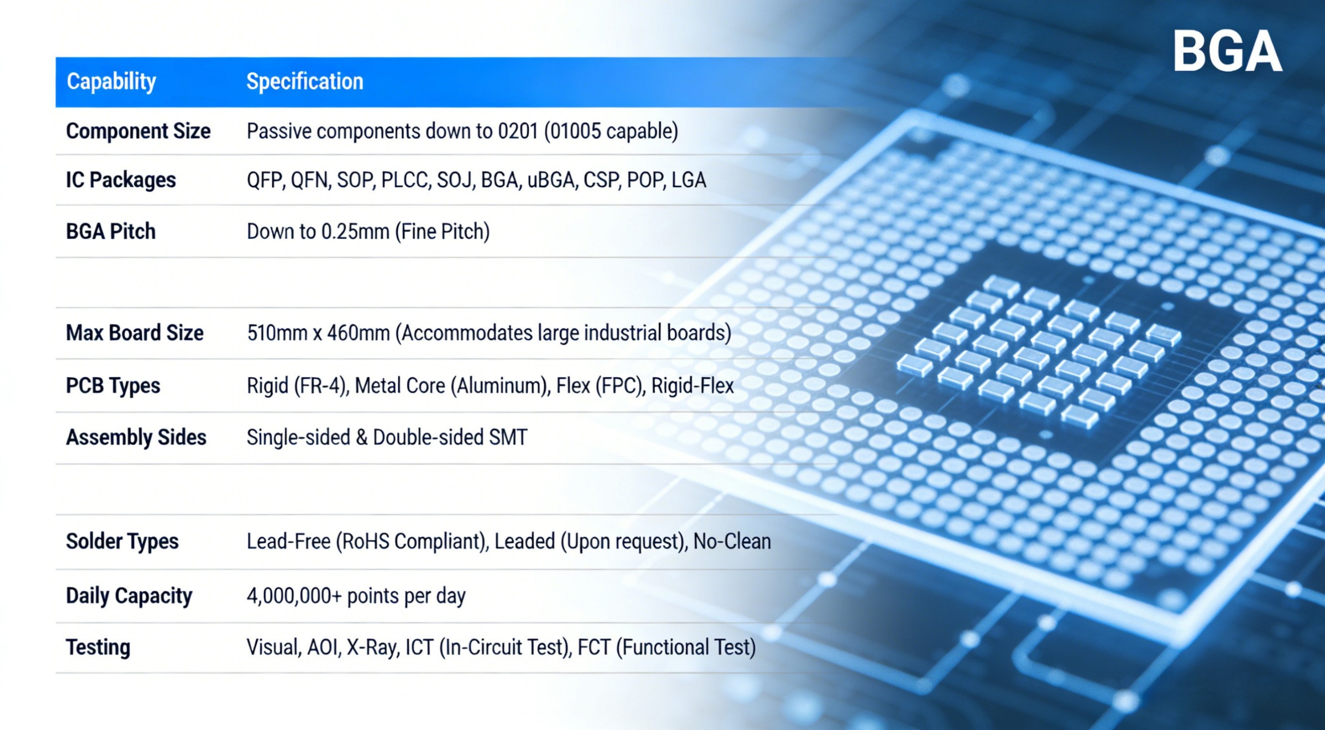 BGA (Ball Grid Array): Down to 0.25mm pitch.