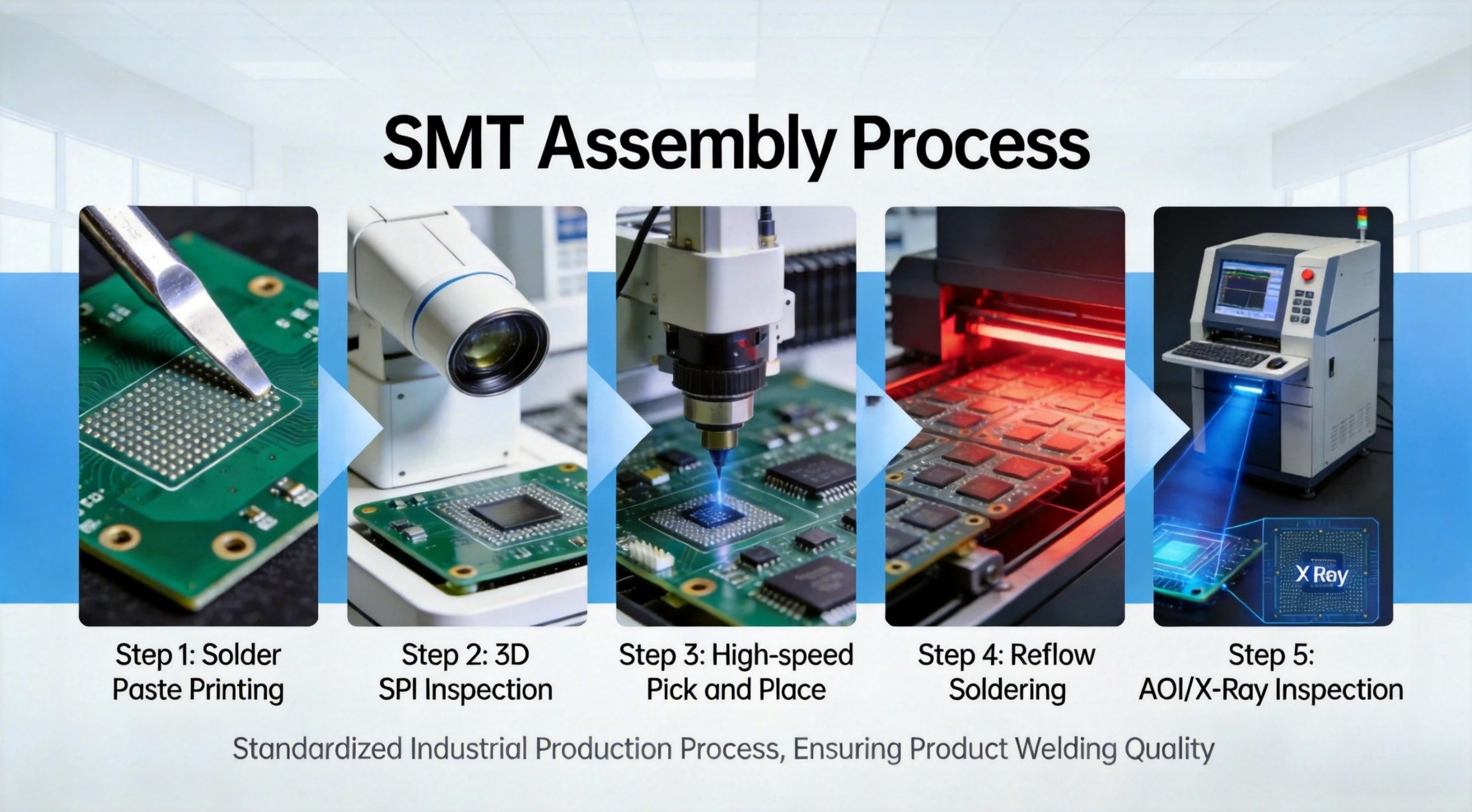 Solder Paste Inspection (SPI): Before mounting, 3D SPI machines inspect the paste height and volume to prevent soldering defects at the source.